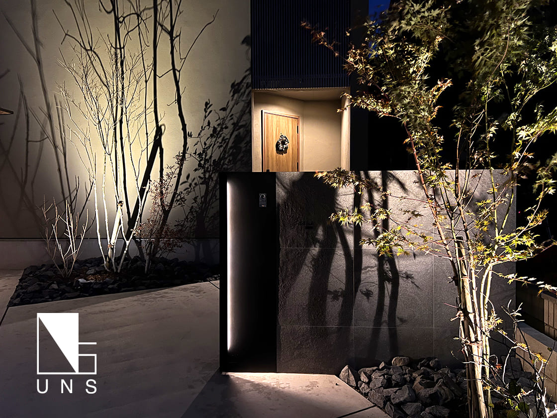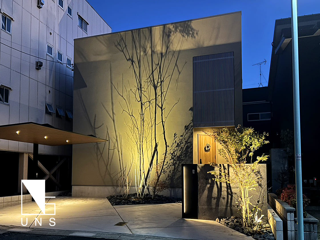 門柱・植栽・照明のみでファザードデザインを構成し、昼は落ち着いた佇まい、夜は植栽の影を外壁に映し出し、壁面をスクリーンとして扱うことで照明そのものをデザイン要素に昇華しています。